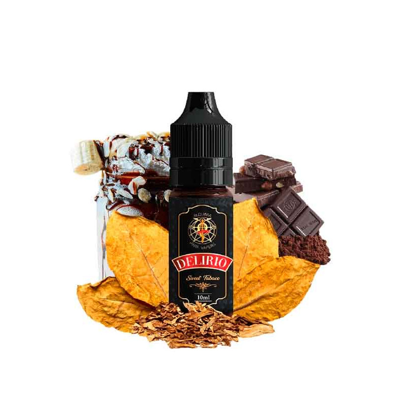 El líquido Delirio sales de Alquimia para Vapers Sales de Nicotina es una mezcla única de tabacos rubios, vainillas, galletas, chocolate negro, yogurt edulcorado con nata, toques de batido de plátano con moka y caramelo tostado, coronado con un ingrediente secreto para darle el toque final a este sabor único cargado de matices.
